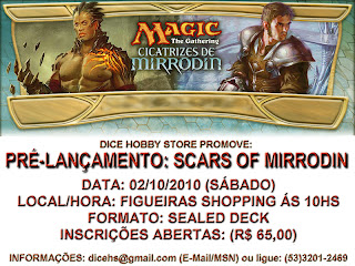 Valor da inscrição: R$65,00 – Cada participante receberá 6 boosters Cicatrizes de Mirrodin.